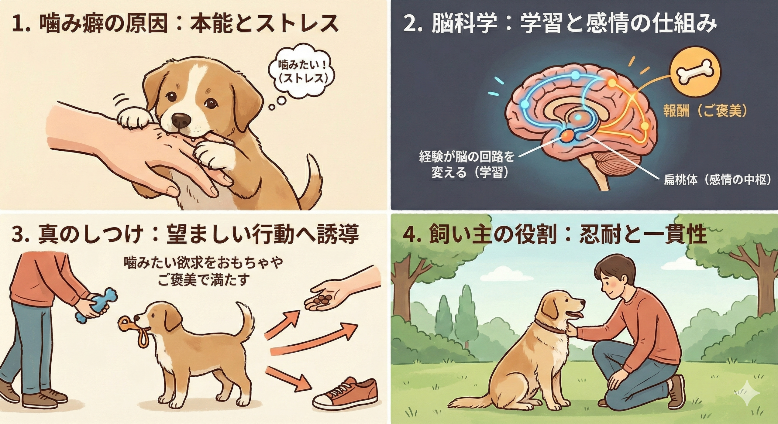 - 人間との関係: 家庭犬において、飼い主と犬の関係は「群れのリーダーと部下」というよりも、「親と子」あるいは「異種間のパートナー」としての社会契約に基づいています。
