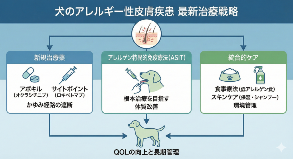 犬のアレルギー性皮膚疾患の治療は、過去の「ステロイド一辺倒」の時代から、病態メカニズムに基づいた「分子標的治療」と「包括的ケア」の時代へと進化しました。